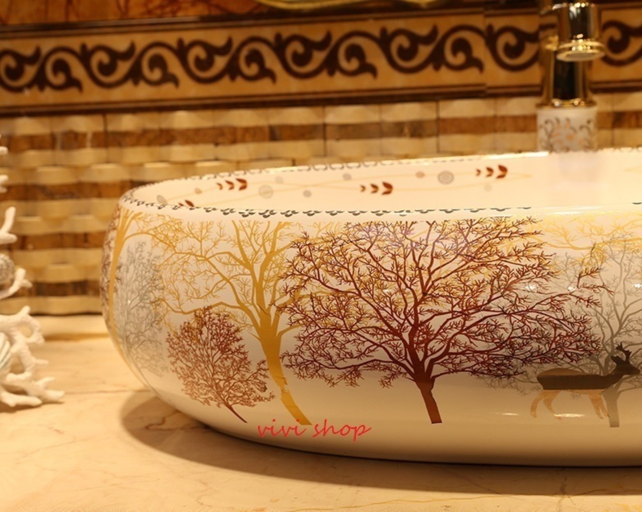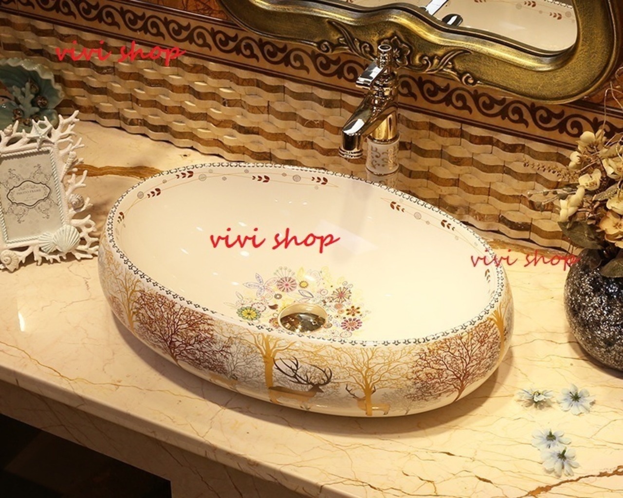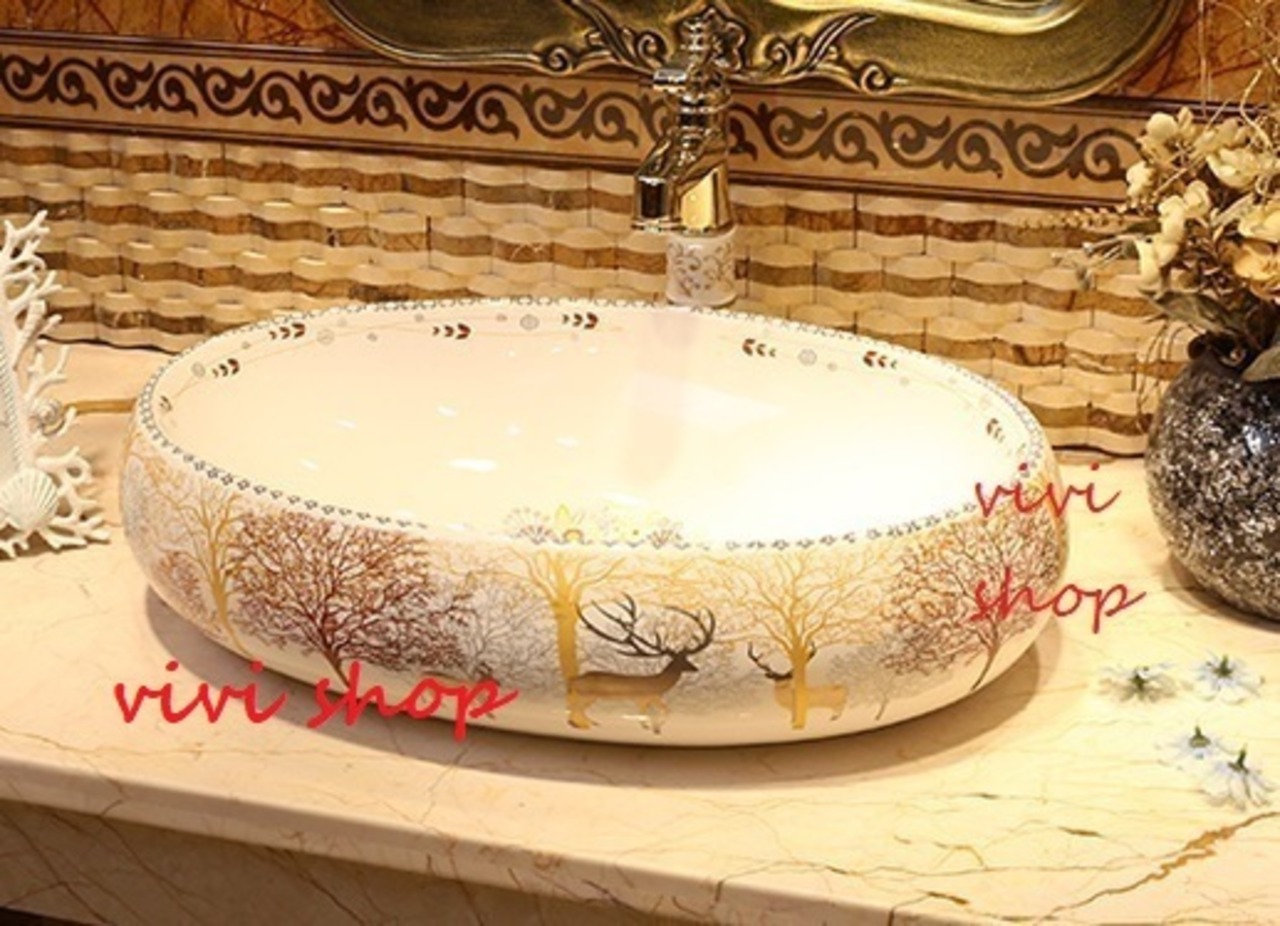 1220F61豪華洗面ボウルセット陶器洗面台 トイレ 手水鉢 手洗器 手洗い鉢 洗面器 蛇口 排水金具付き