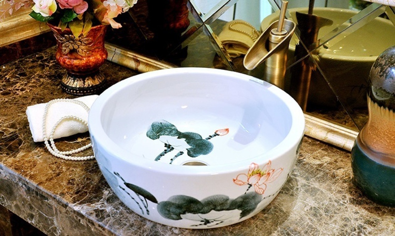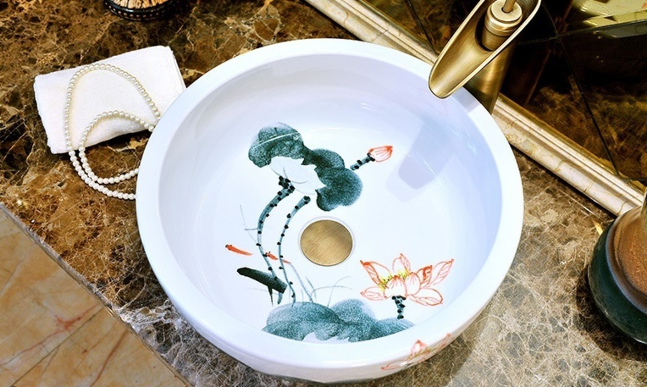 1220F140-2豪華洗面ボウルセット陶器洗面台 トイレ 手水鉢 手洗器 手洗い鉢 洗面器 蛇口 排水金具付き