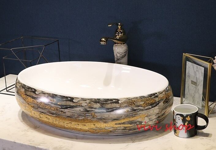 0121F159-1豪華洗面ボウルセット陶器洗面台 トイレ 手水鉢 手洗器 手洗い鉢 洗面器 蛇口 排水金具付き