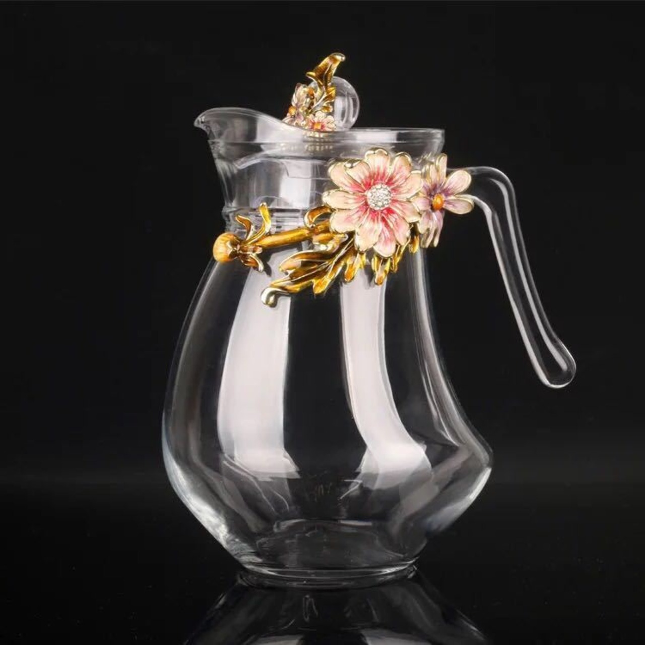 キク花柄ガラス製 ティーセット 高級コーヒーカップセット 菊ティーセット 托盤付き