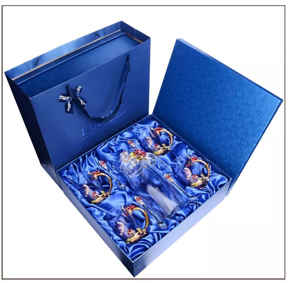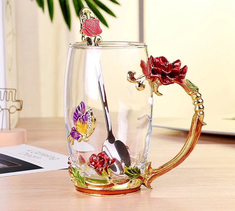 薔薇花柄ガラス製 ティーセット 高級コーヒーカップセット 上品バラティーセット .托盤付き