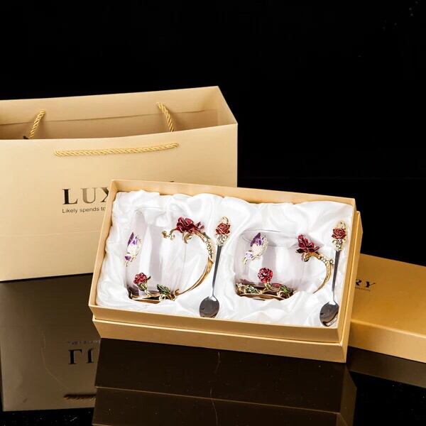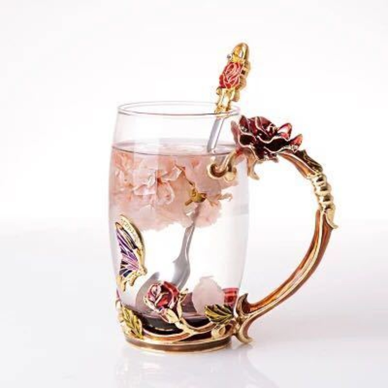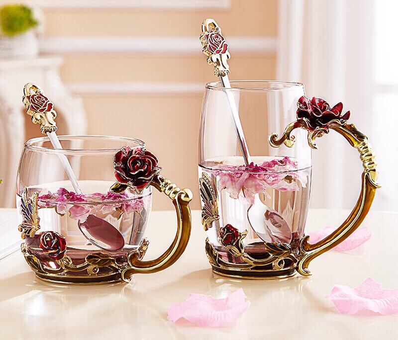 赤バラ ガラス製 ティーカップ 2客セット食器 コーヒーカップ おしゃれ