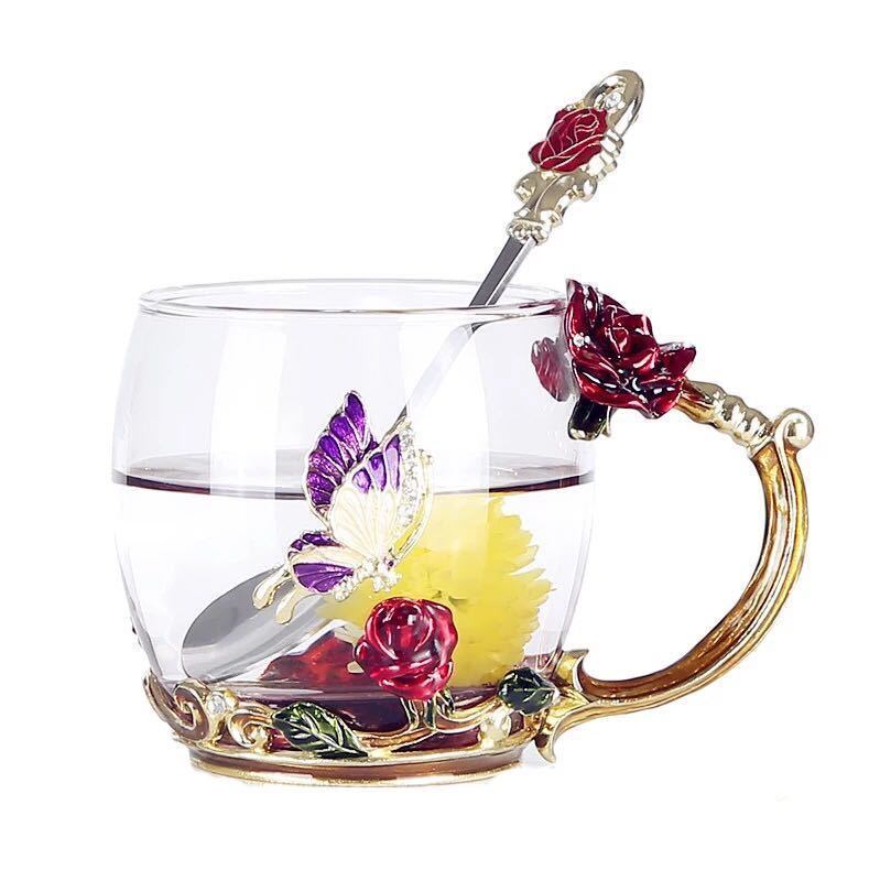 赤バラ ガラス製 ティーカップ 2点セット食器 コーヒーカップ~姫系雑貨 ガラスカップセット