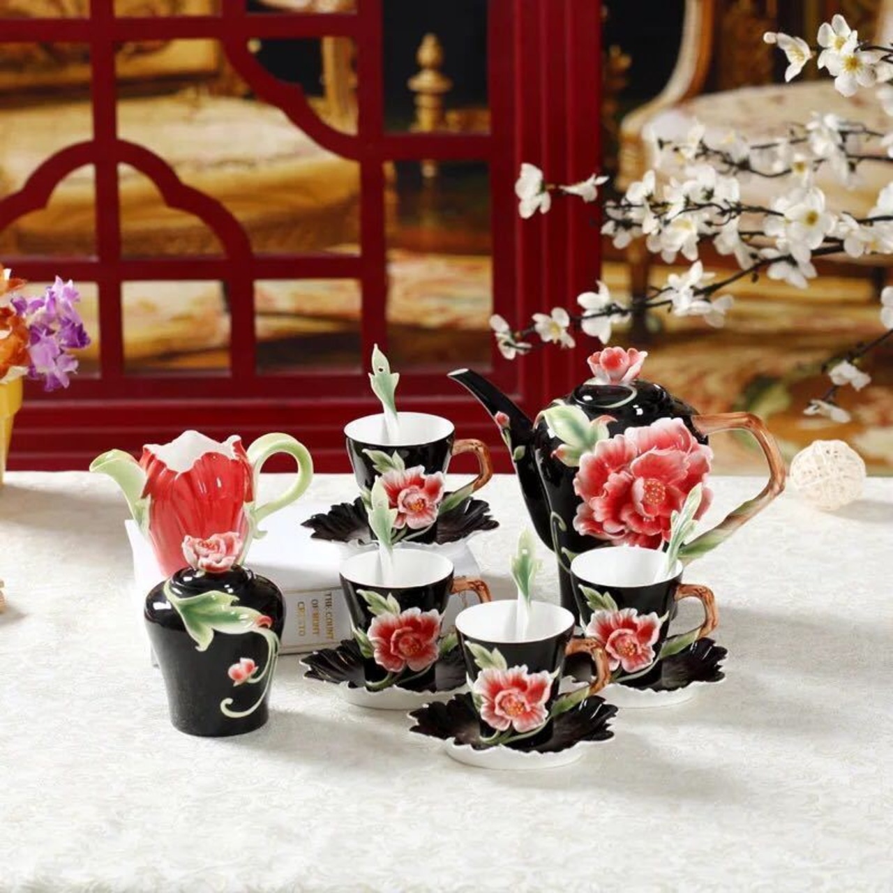 上品ティーカップ&ソーサー 4客セット 花柄.陶器ティーセット 立体花型