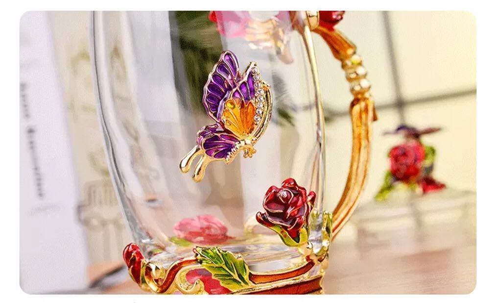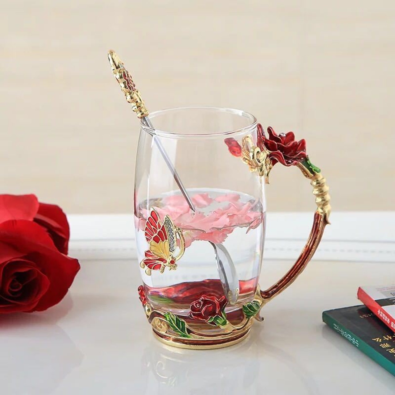 赤バラ花柄ガラス製 ティーカップ 2点セットコーヒーカップ