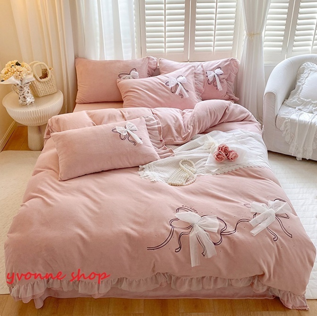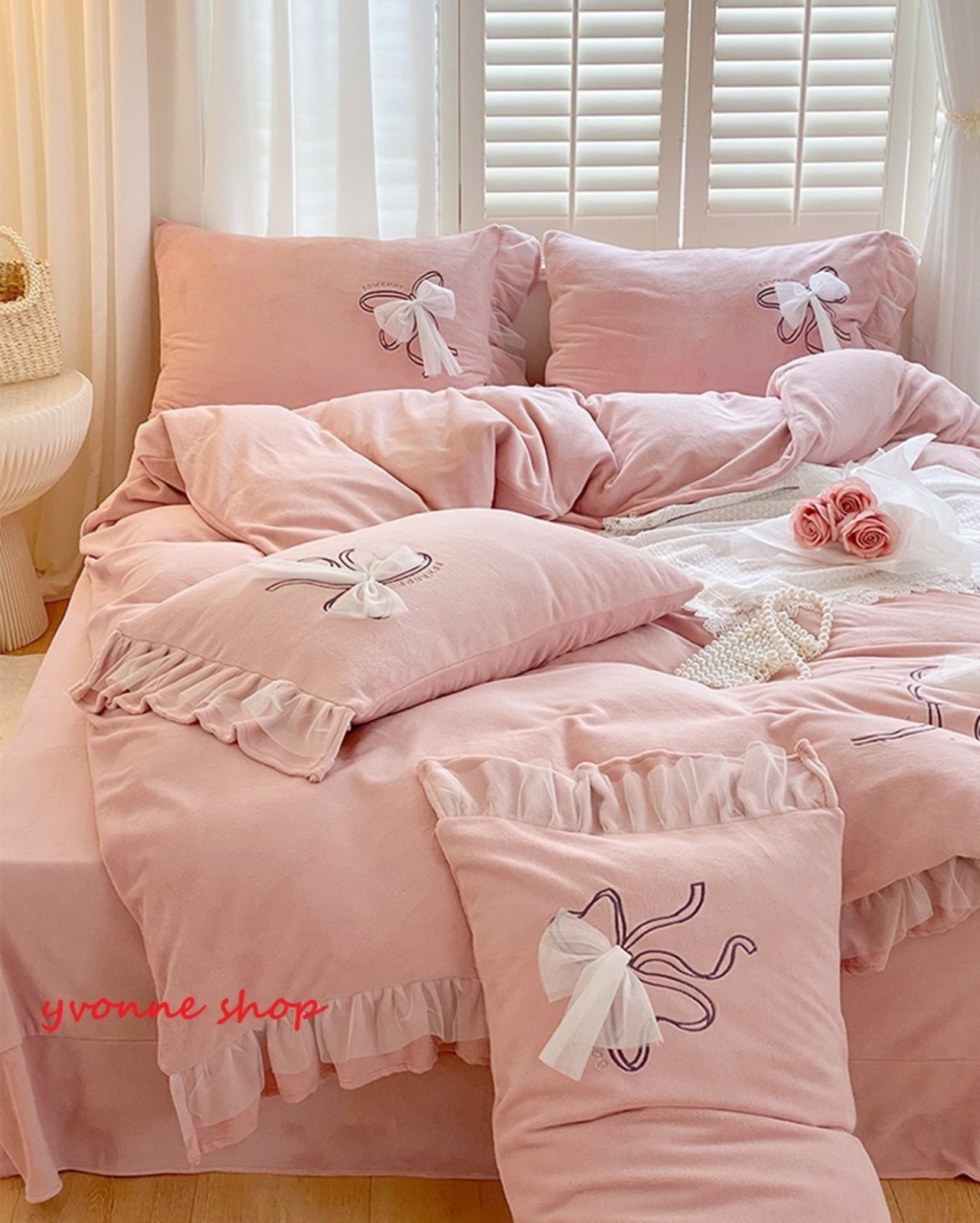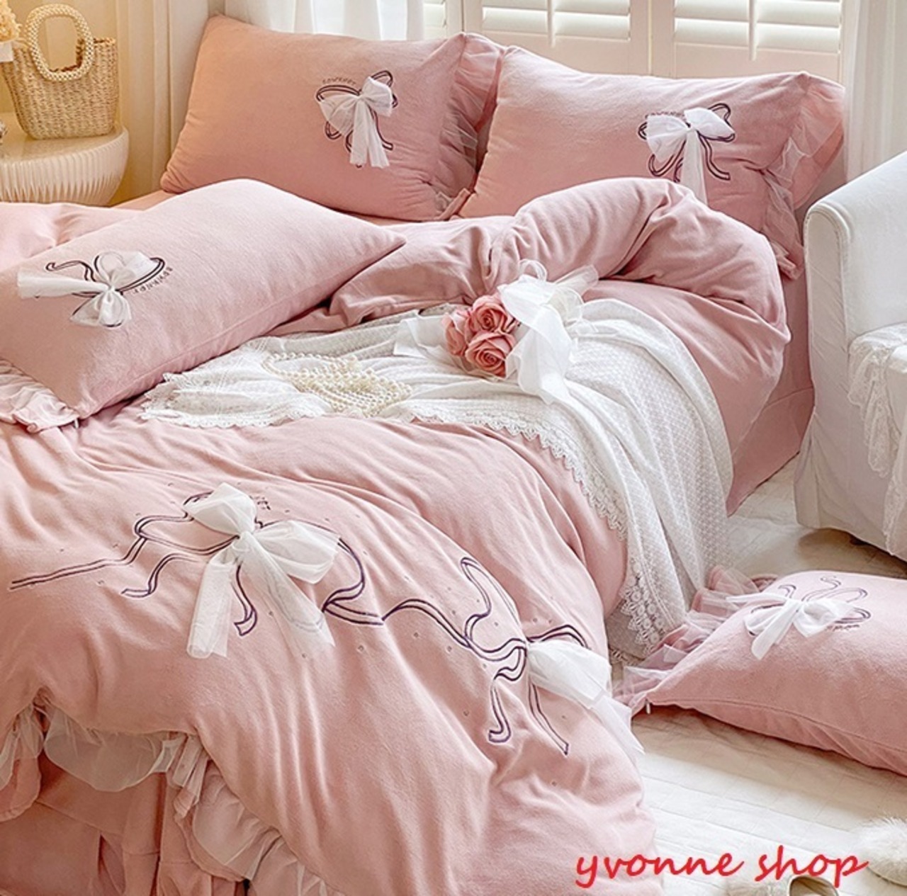 BS29冬用フランネル寝具 ワイドダブル ベッド用品4点セット ボックスシーツ ピンク
